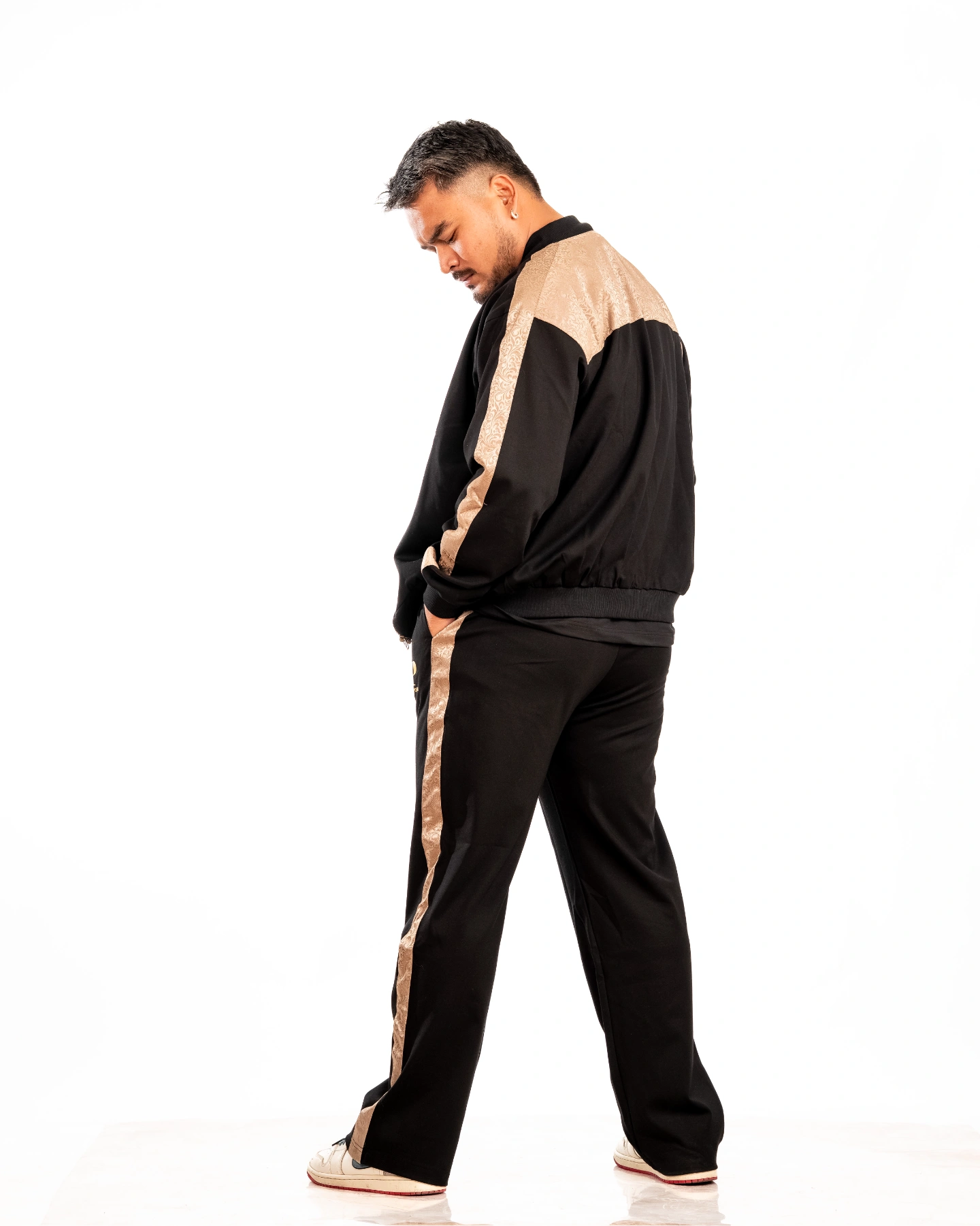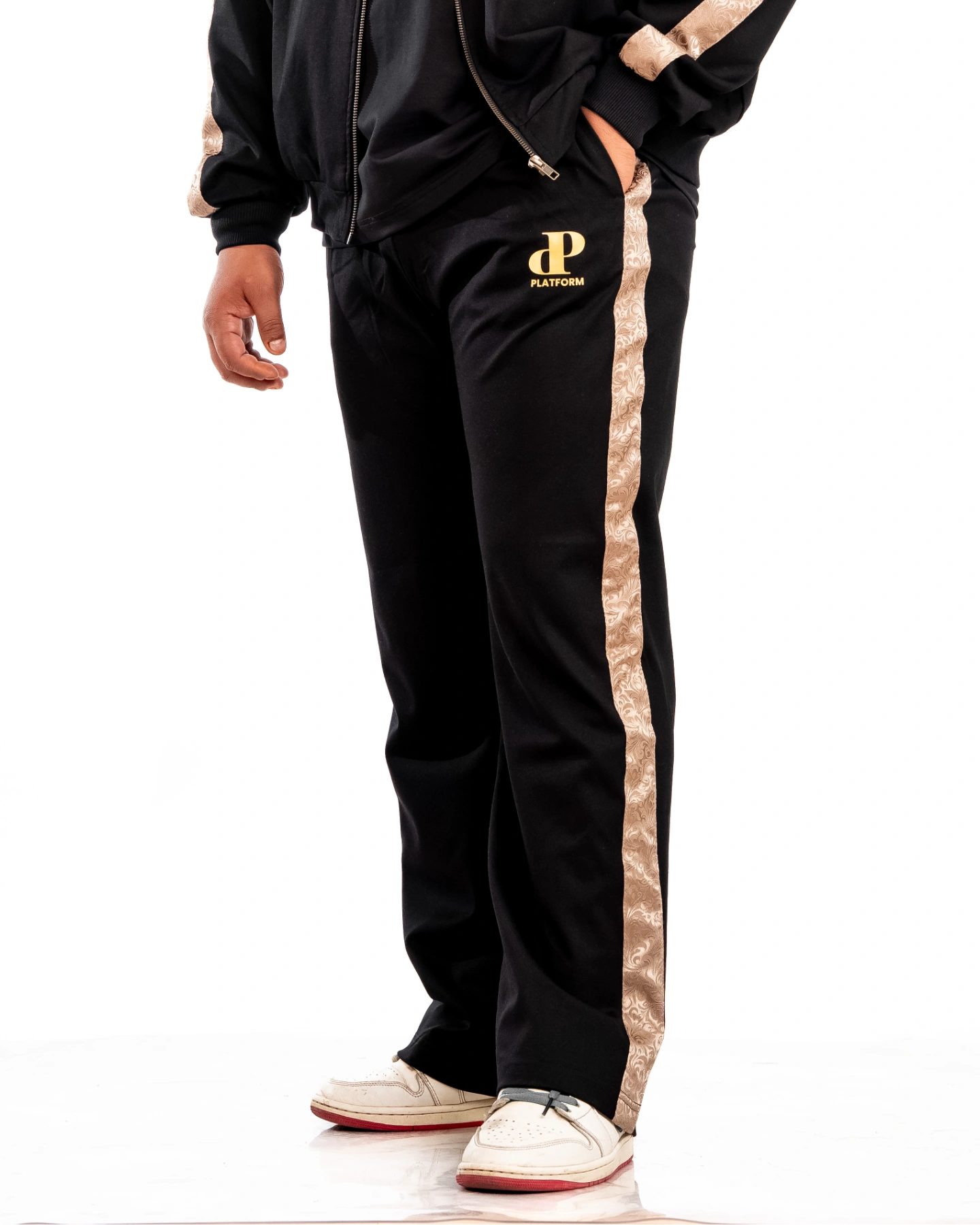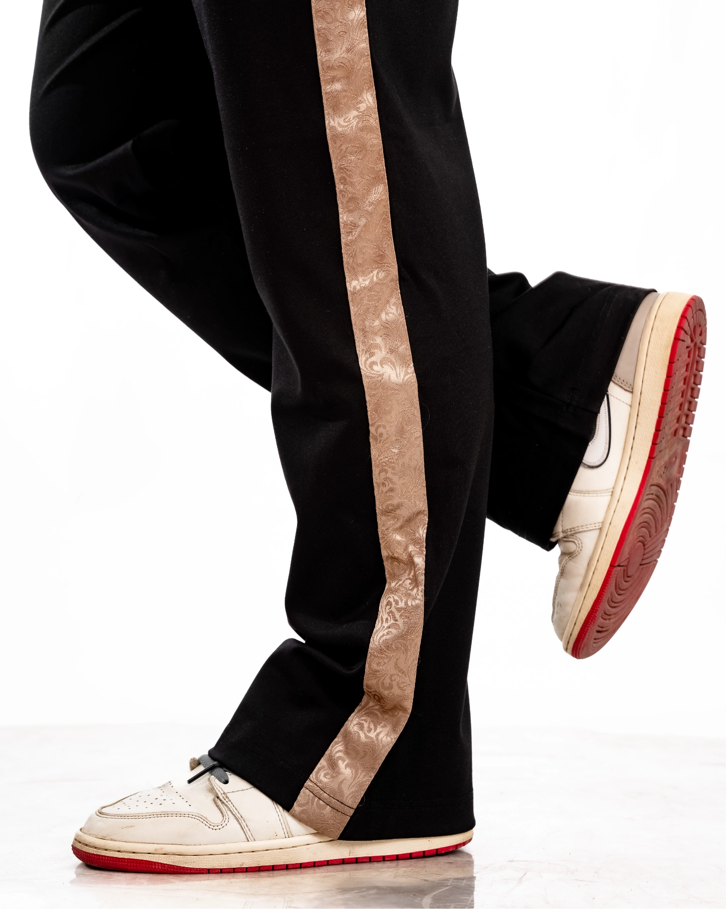 Elevate your streetwear game with the Platform Black Joggers, featuring striking gold brocade stripes for a touch of luxury.