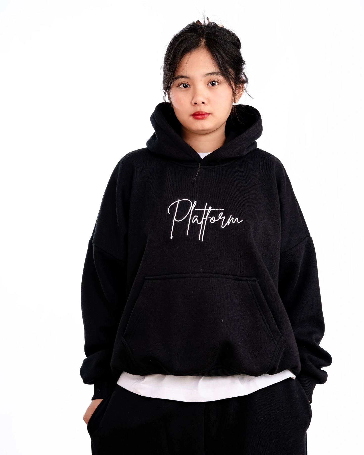 Designed for versatility and durability, this hoodie pairs effortlessly with any fit—perfect for those who want comfort without compromising on style. The front features a bold calligraphy-style Platform embroidery, giving the hoodie a unique handcrafted aesthetic. Adding to the premium detailing, the hood includes an embroidered Platform logo on the cap, creating a subtle yet standout branding element from every angle.
